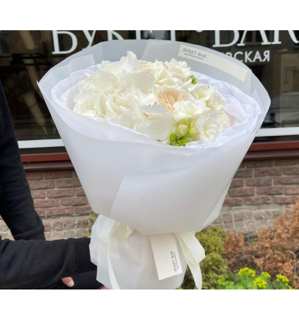 В этом букете прекрасно сочетаются 1 нежная белая гортензия, символизирующая изобилие и благополучие, и 3 белых фрезии, которые добавляют нежности и изящества. 5 роз сорта White O'Hara приносят в букет нотки роскоши и романтики. Букет украшен репсовой лентой, дизайнерской упаковкой, а также фирменной биркой и наклейкой, что делает его уникальным и восхитительным подарком. Подарите этот авторский букет, чтобы создать незабываемые впечатления и подчеркнуть особенность момента для вашего особенного получателя.