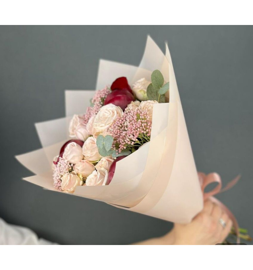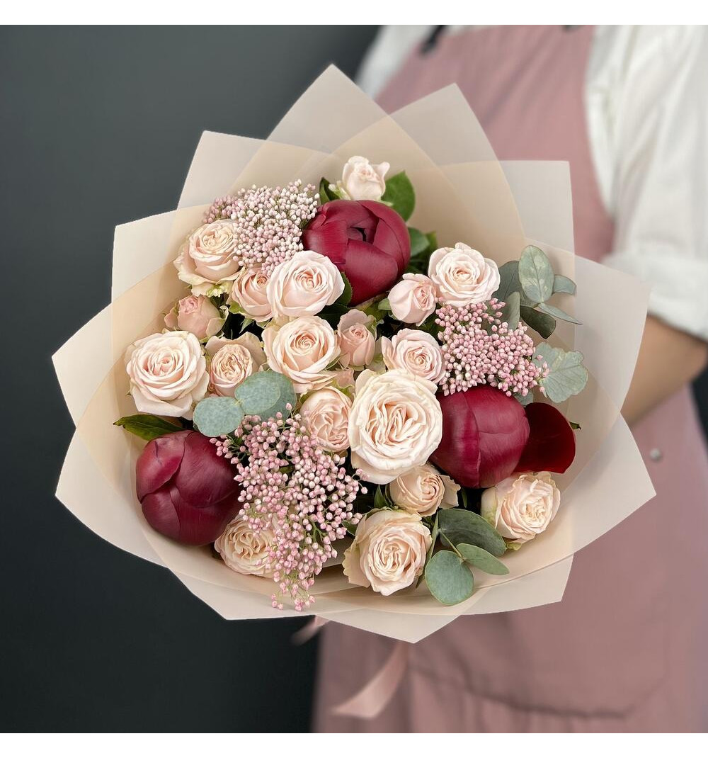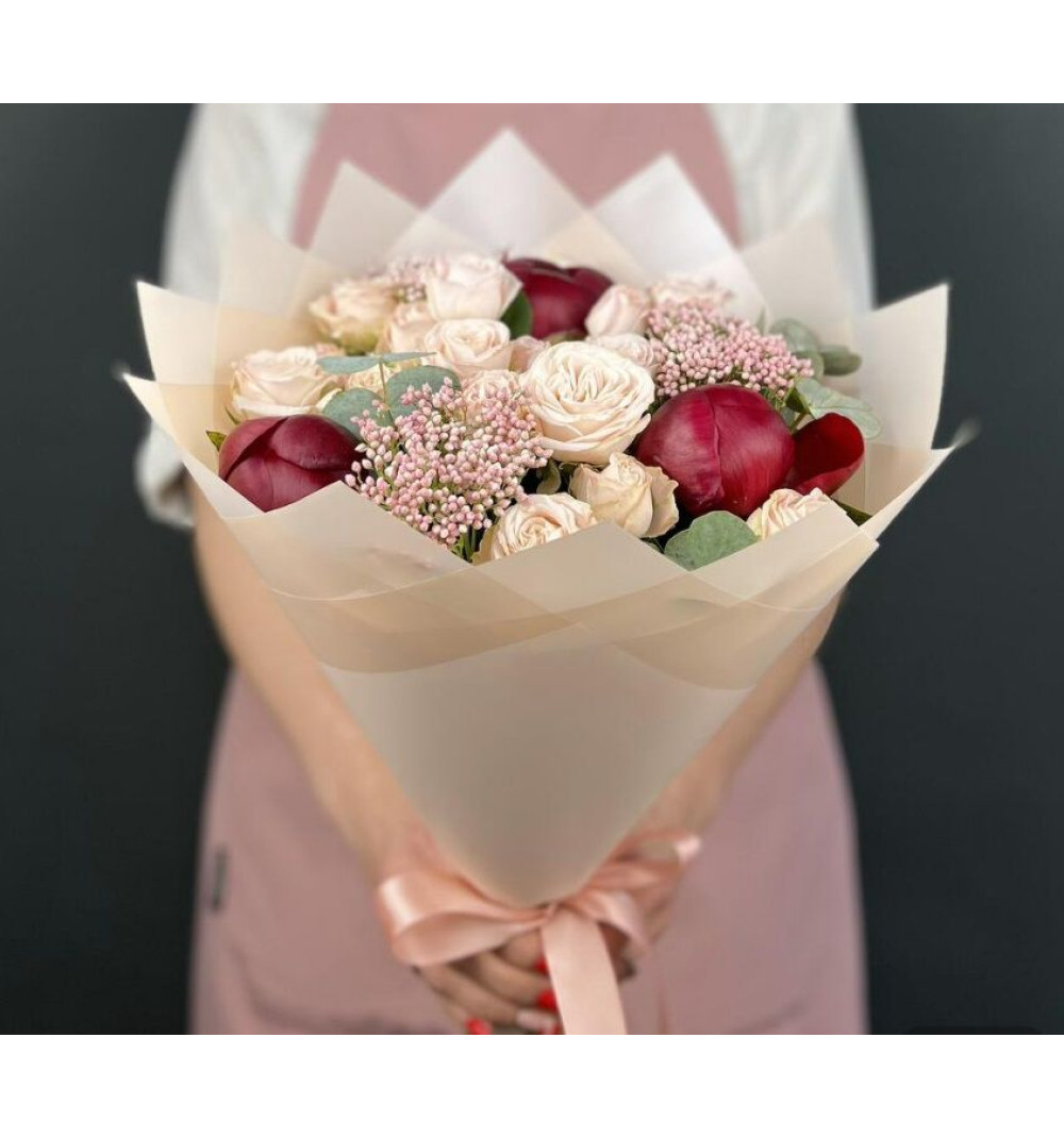 Купить Авторский букет из красных Пионов и кремовых кустовых Роз с Озотамнусом в Аральске за 20 000 ₸ | интернет-магазин «Guls»