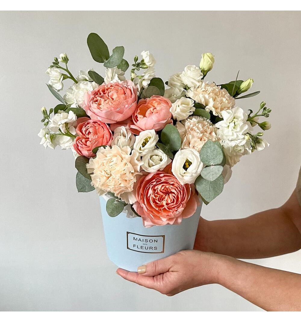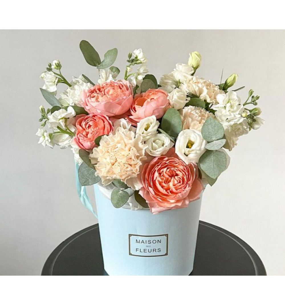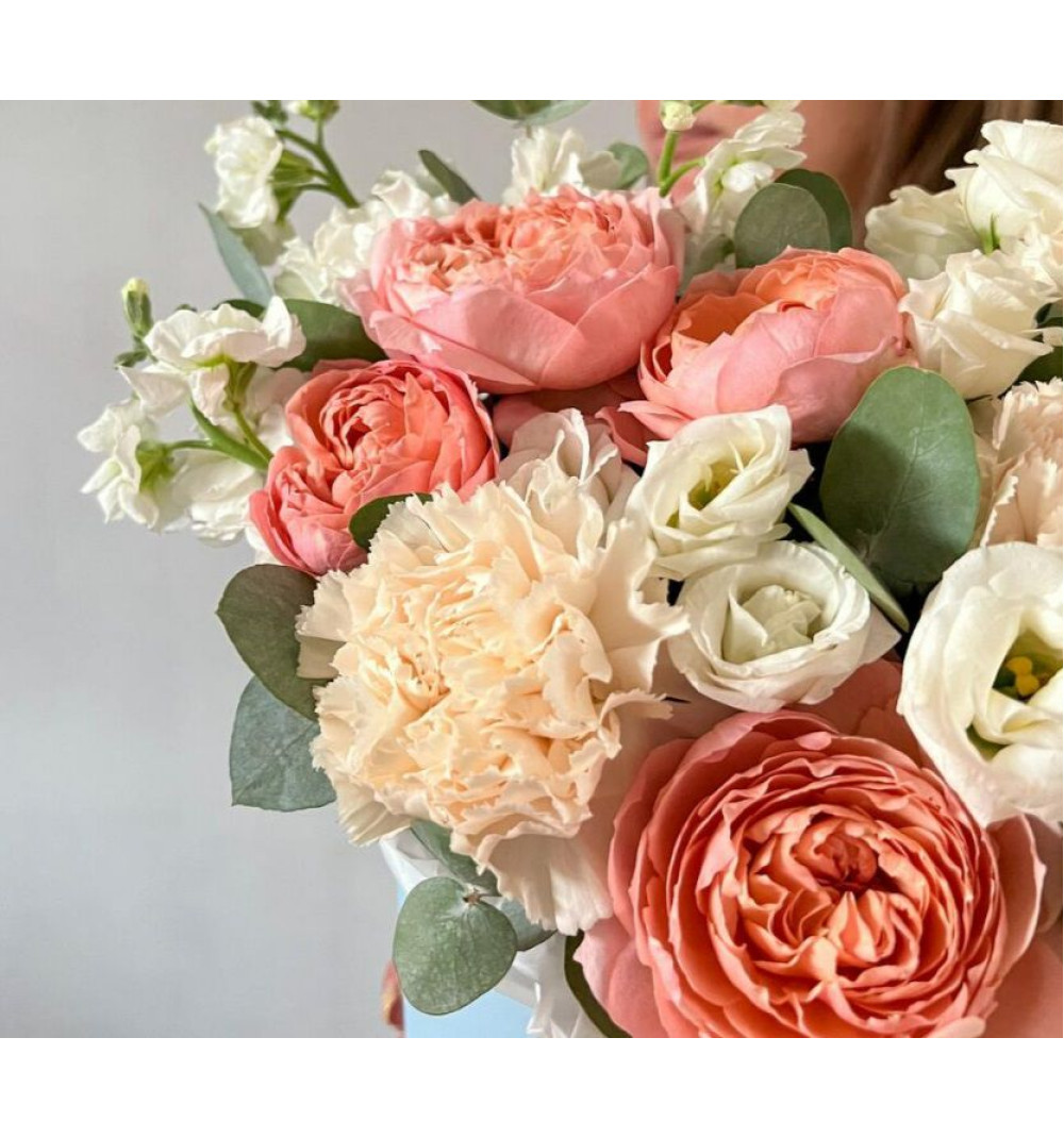 Композиция с персиковыми пионовидными розами и маттиолой.