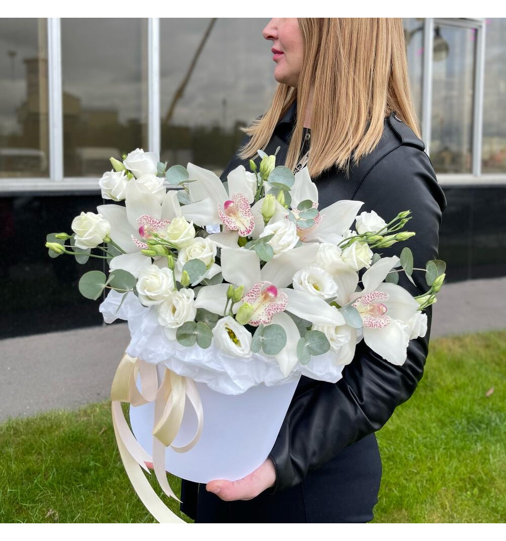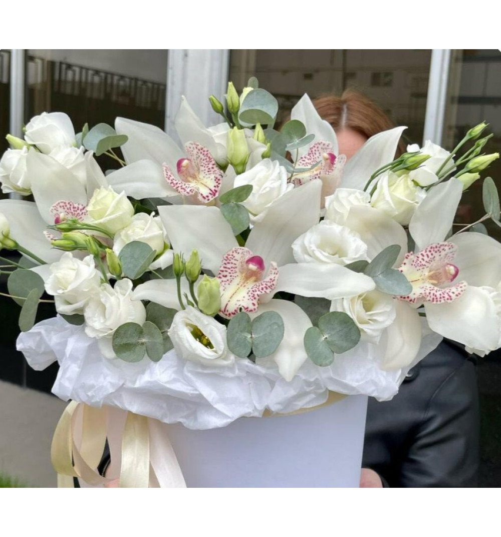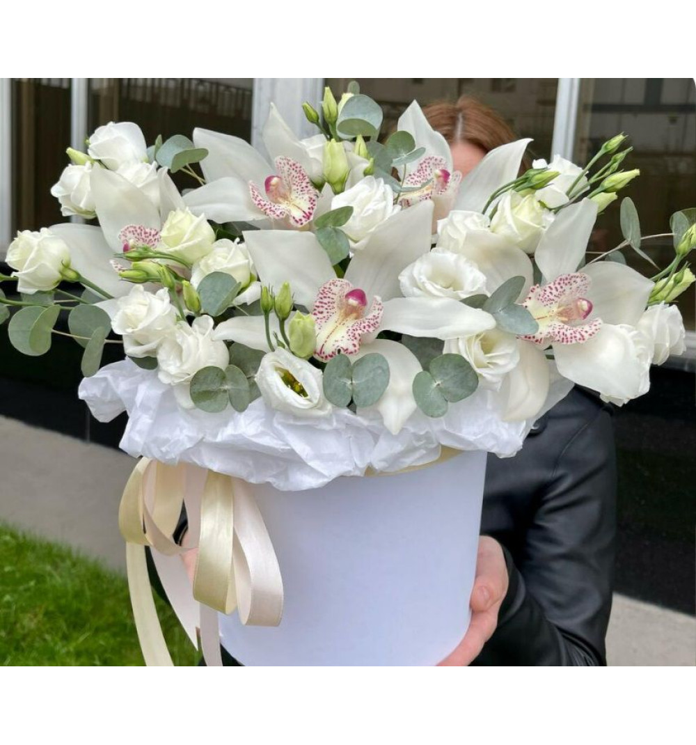 Купить Орхидея белая с эустомой в коробочке в Аральске за 25 000 ₸ | интернет-магазин «Guls»
